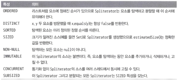- Spliterator 자체의 특성 집합을 포함하는 값을 리턴