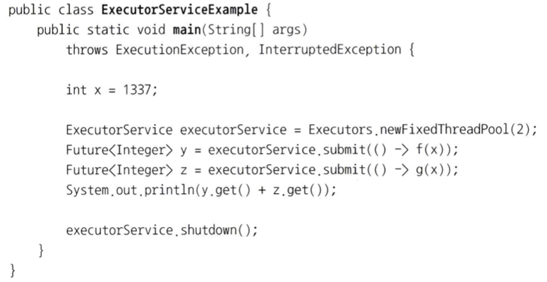 그럼 저 단순한 로직을 single-thread로 수행하면 result값은 f수행시간 + g수행시간 이 걸린다.