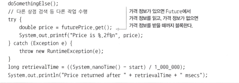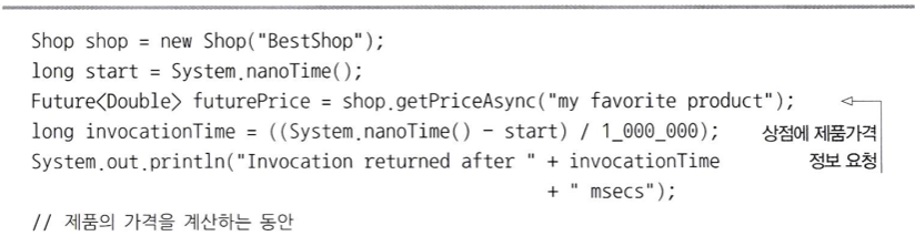 - 상점 코드는 비동기 API를 제공하므로, getPriceAsync() 실행 즉시 Future이 리턴된다. 클라이언트는 리턴된 Future를 이용해서, 나중에 결과를 받아볼 수 있다.